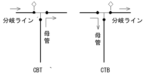 上の変換することが出来る分岐シンボルは、直管である母管から分岐ラインが直角に分岐されている場合のものであり、CBTやCTBなど曲がり部から分岐ラインがスタートしているシンボルは変換の対象ではありません。