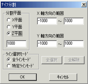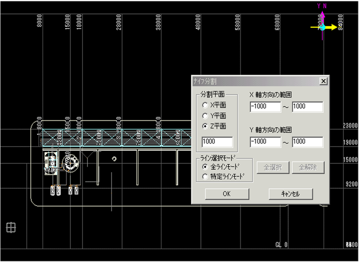 プラントエリアの(X,Y,Z)=(0,0,1000)の位置にナイフ分割するための平面と、【ナイフ分割】ダイアログが表示されます。