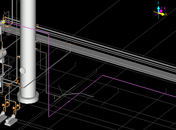 一次選択状態の配管ラインの分割したい配管をクリックし、二次選択状態にします。ライン分割位置は、管上をヒットしてください。