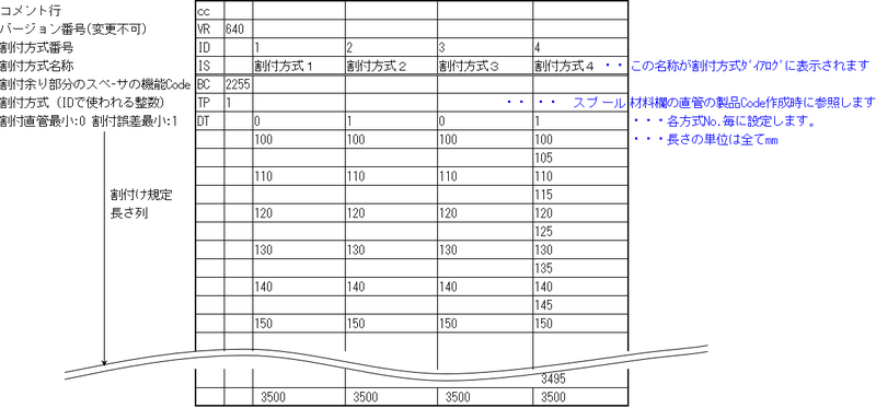 一般に定尺管割においては選択した配管の直管部分を指定した長さで割付けますが、この直管割付では割付ける直管長さをAGRGLP.csvに記述指定し、なるべく長い直管順に割付けます。-3~6mmは割付誤差とします。