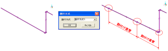 割付方式を選択して「OK」とすると、選択した配管の直管部分をAGRGLP.csvで定義された割付方式で割付けます。