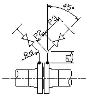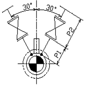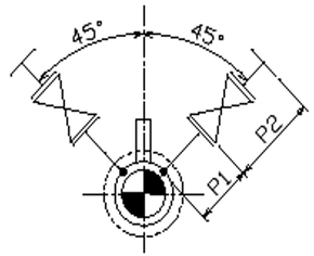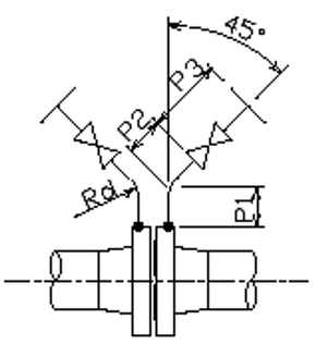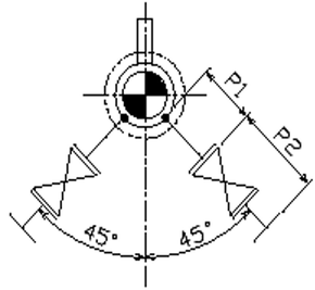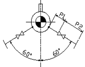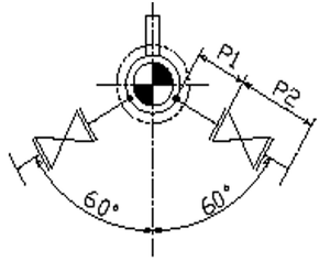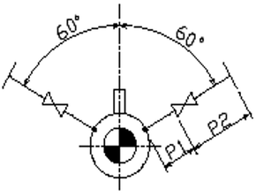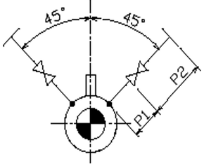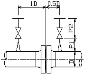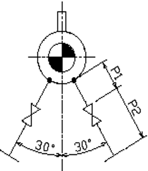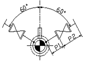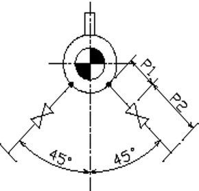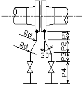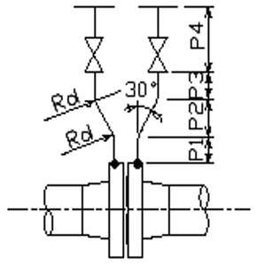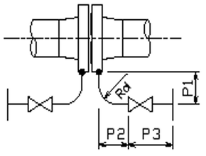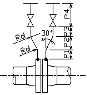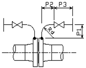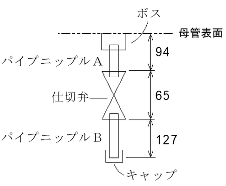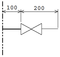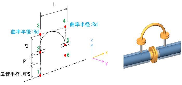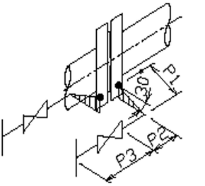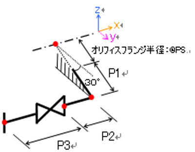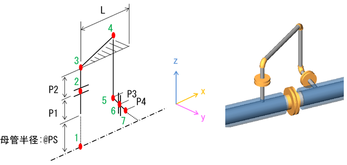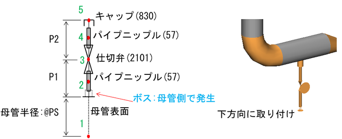 本パターンではP1,P2を定義し母管表面からP1の位置に仕切弁、P1+P2の位置にキャップを定義して、それらの中間にパイプニップルを定義します。各部品の押さえ位置は直付け(11)指定とします。P1,P2はあくまでも直付け部品をおく目安として定義します。