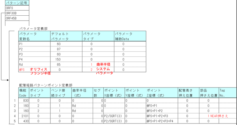 機能Code ポイントタイプ ベンド接続タイプ 曲率半径(式) セグ数 ポイントX座標(式) ポイントY座標(式) ポイントZ座標(式) 配管高さ押え位置 部品押さえ位置 Tag No. 1 830 0 0 0 0 0 0 0 0 0 2 120 0 0 0 0 0 0 @PS+P1 0 0 3 160 0 0 0 0 0 0 @PS+P1+P2 0 0 4 160 0 0 0 0 L @PS+P4+P3 @PS+P1+p2 0 0 5 160 0 0 0 0 L @PS+P4+P3 0 0 0 6 120 0 0 0 0 L @PS+P4 0 0 0 7 810 0 0 0 L @PS 0 0 0