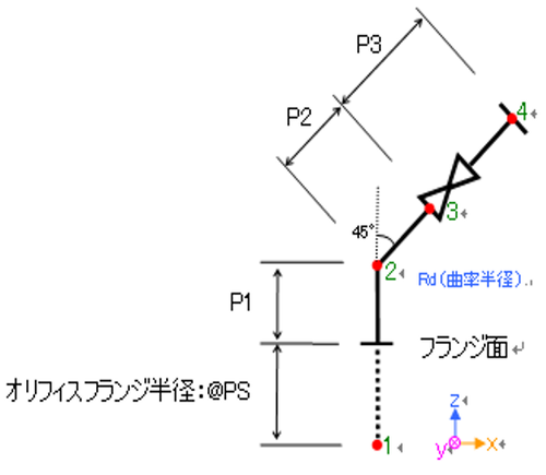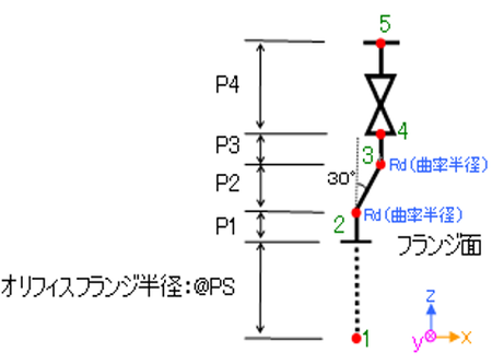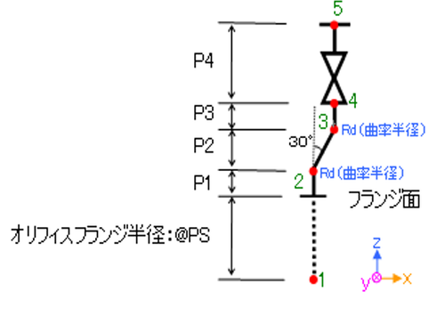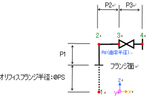 機能Code ポイントタイプ ベンド接続タイプ 曲率半径(式) セグ数 ポイントX座標(式) ポイントY座標(式) ポイントZ座標(式) 配管高さ押え位置 部品押さえ位置 Tag No. 1 830 0 0 0 0 0 0 0 0 0 2 120 0 0 0 0 0 0 @PS+P1 0 0 3 160 2 1 Rd 0 0 0 @PS+P1+P2 0 0 4 160 2 1 Rd 0 L 0 @PS+P1+P2 0 0 5 120 0 0 0 0 L 0 @PS+P1 0 0 6 810 0 0 0 0 L 0 @PS 0 0