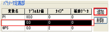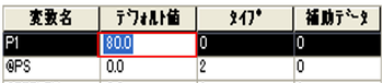 パラメータ変数名 デフォルトパラメータ パラメータタイプ パラメータ補助データ P1 100 0 0 P2 150 0 0 @PS 0 2 0