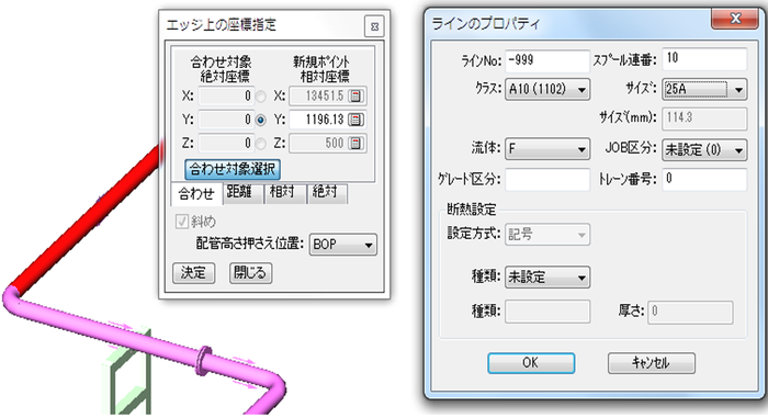 母管の分岐位置を決定すると、配管仕様設定ダイアログが現れるので、分岐配管の仕様を入力します。