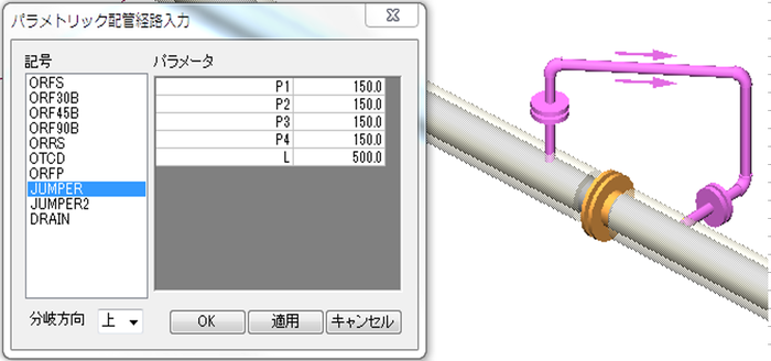 分岐方向を選択、パラメータを設定して"OK"ボタンを押すと設定したパラメータで分岐配管が作成されます。