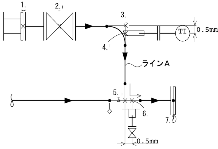 - PI,TI,ドレン,ベント等、標準的な形状で、主配管から分岐し、どこにもつながらないラインを指します。