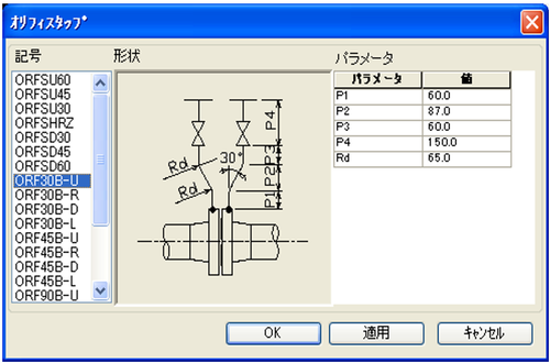 パラメータはポイント座標や曲率半径内で使用する変数を定義します。ここで定義した変数とデフォルト値がオリフィスタップダイアログに表示されます。パラメータにはシステムパラメータがあり、自動的にシステムがその値を設定します。 |