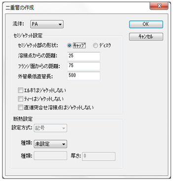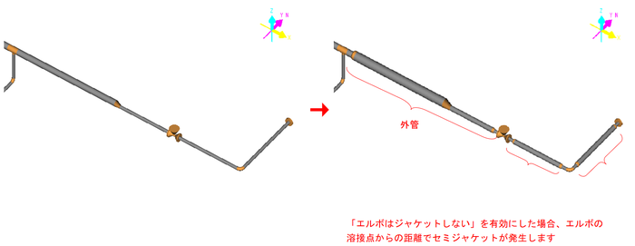 このときダイアログ上のチェックボックスによりエルボ、ティー、直進突合せ溶接点はそれぞれジャケットする/しないの設定が可能です。