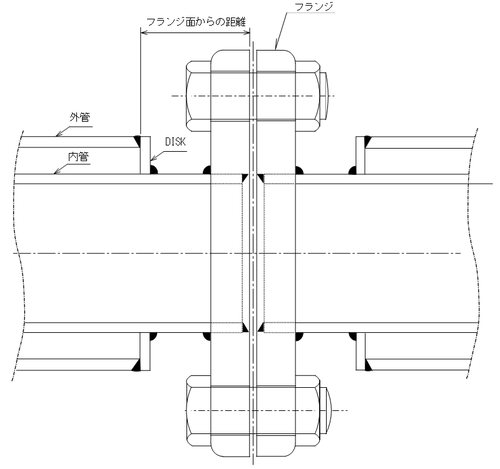 同心異径フランジ上流側のサイズを二重管外管のサイズ(80A)に合わせます。