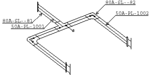 - 下図の例では、内管PL-1001の外管はSL--81,内管PL-1002の外管はSL--82です。mrout保存終了後は、マイナスラインNo.の枝管は母管のスプール図番と同じにしているため、SL--82がSL--81と同じスプール図番になってしまいます。