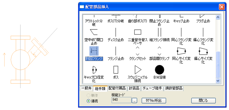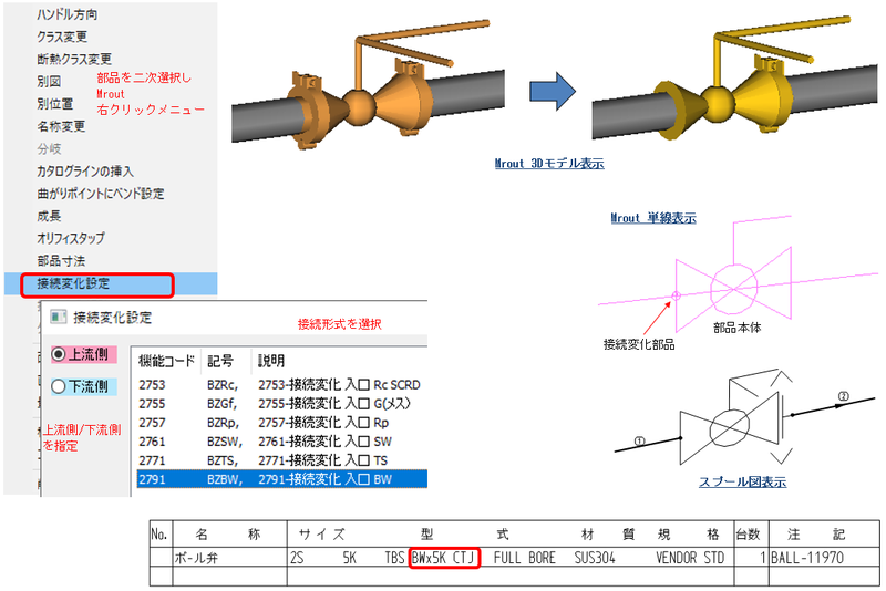 配管部品、付属品、計装品など「部品本体」に「接続変化」を設定することでその部品の片側の接続形式を変更することが可能です。 この「部品本体」と「接続変化」を合わせて「セット部品」と呼びます。