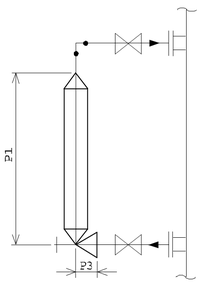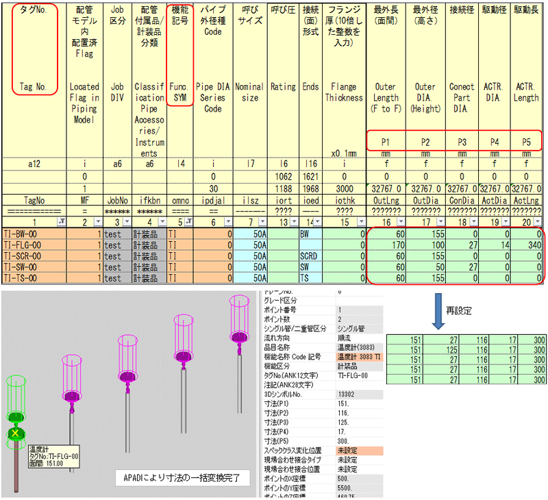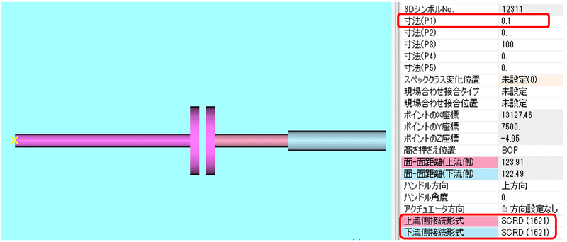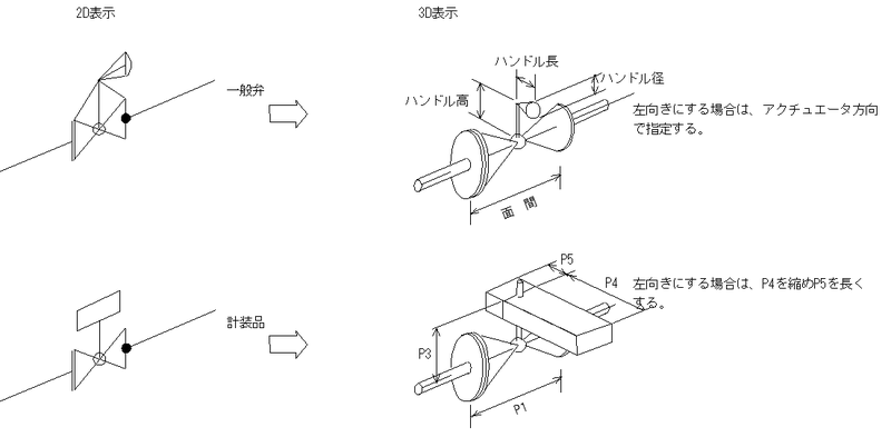 全ての配管付属品、計装品の外形寸法P1~P5の値は1.0mm~32,767mmの範囲で設定されます。