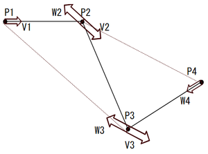 ホース長は、「表現方法」の手順5の様に、「ホース入力」により設定(入力)した各点を通るなめらかな曲線で結んだ(円弧補間)軌跡の長さです。