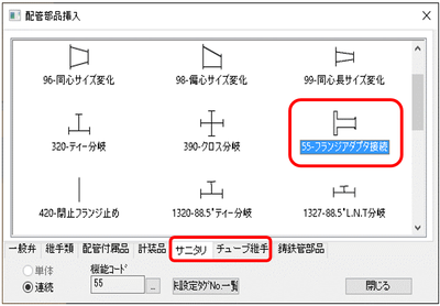 「配管部品挿入」ダイアログのサニタリまたはチューブ継手の中にある「55-フランジアダプタ接続」を選択します。