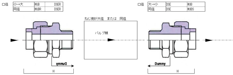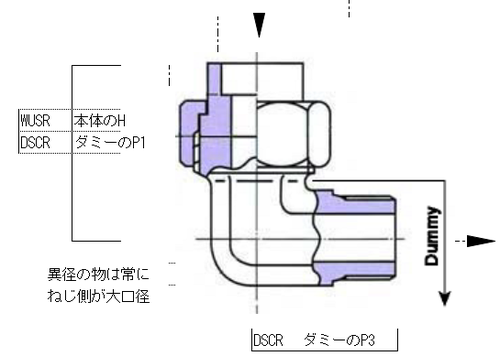 流れ順でダミー→本体に事例(流れ順が逆の場合は「Set部品(差込接続) ユニオンC形 曲がり SW-(R,SCRE)」を参照)