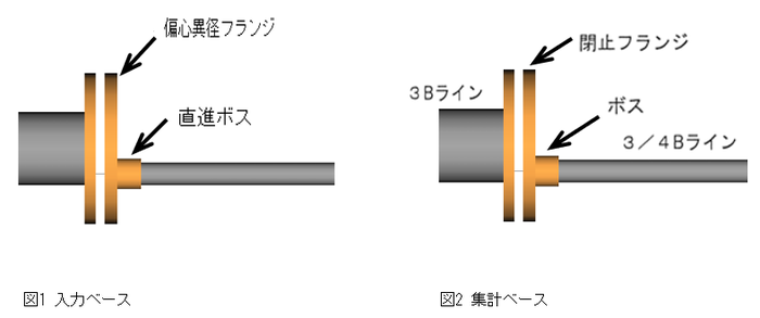 サニタリフランジアダプタは入力後以下の判定基準によって反転フランジアダプタ接続:56:FLARに切り替わります。機能code 55 or 56 選択の判定基準 機能code 同径 JIS → サニタリへの流れ 55:FLA サニタリ → JISへの流れ 56:FLAR 異径 流れ方向に関係なく JIS側が大>サニタリ側小サイズ 例)1S x25A 55:FLA JIS側が小<サニタリ側大サイズ 例)1.5Sx25A 56:FLAR V9.10以降、フランジアダプタ(55:FLA)と反転フランジアダプタ(56:FLAR)はどちらを入力しても上記の基準に合うように自動で切り替わります。