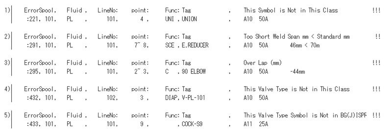 配管Dataをチェック(PMS未登録部品、シンボル前後角、溶接間長さ、食込みチェック、およびAPADBSにて設定した付属品、計装品とそのクラスサイズの相フランジとの接続等)し、エラー情報をe_mrc(File名)に書き込みます。
