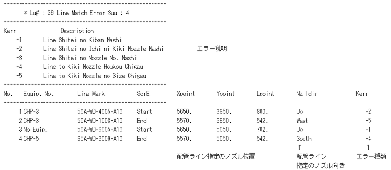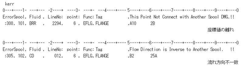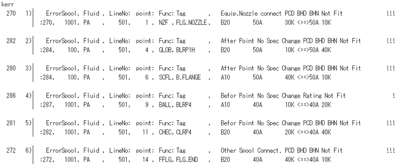表示はKERR(エラーCode)、スプール図番、流体、ラインNo.の順で、各エラーCodeごとに、ヘッダとしてエラーの内容が表示されます。