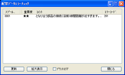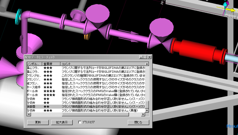 このダイアログにエラー一覧が現れ、エラーのある配管や配管部品の選択と拡大表示ができます。