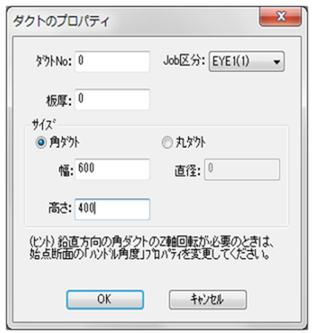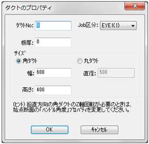 [新規作成]モードに入ると、【ダクトのプロパティ】Dialogが表示されます。