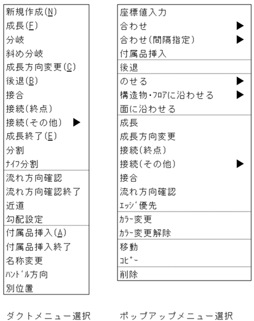 メニューバーの〔ダクト(D)〕-〔接続(終点)〕、またはマウスの右Clickで〔接続(終点)〕を選択します。