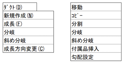 メニューバーの〔ダクト(D)〕-〔接続(その他)〕にカーソルを移動し、斜めいも付け・鉛直方向接続のいずれかのメニューにカーソルを合わせて左Clickしてください。
