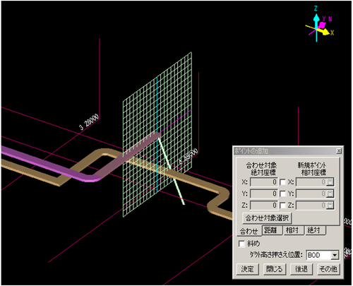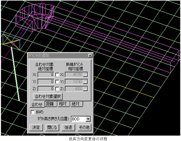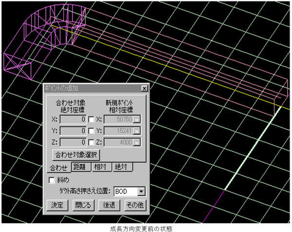 - 斜めダクトをそのまま成長させる場合、「斜め」にチェックを入れます。(「【ポイントの追加】ダイアログ」を参照)