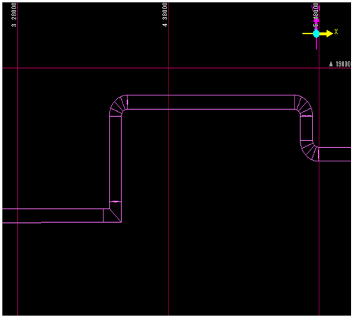 X方向を選ぶと、末端から接続先のダクトの真上までX方向にダクトを振って、接続先ダクトまでZ方向に降ろして接続します。