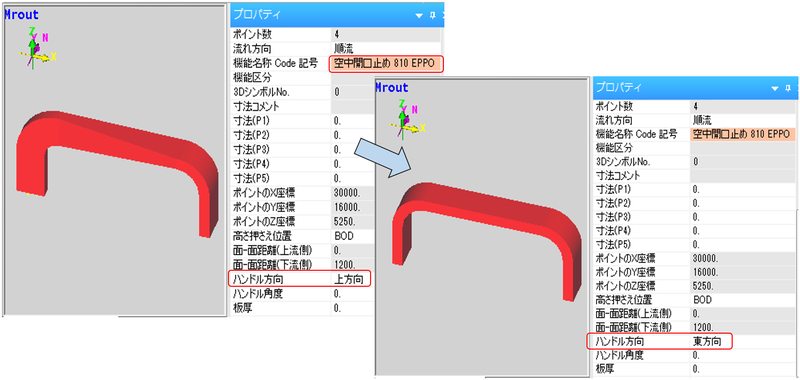 ダクトの第2ポイントが、Z軸方向に伸びる場合(鉛直ダクト)で、Z軸回りに回転を行いたい場合は、始点断面の「ハンドル角度」プロパティに、角度を設定してください。(下図参照)