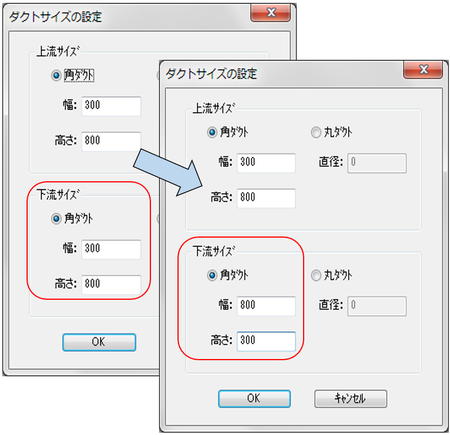 【ダクトサイズの設定】Dialogが表示されますので上流 または下流のサイズを逆さまに入替えます。