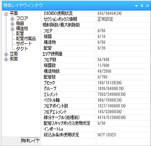 物体レイヤウィンドウ内に以下のように、様々なData量の現在値と制限値が表示されます。制限近くになった場合は、ご注意ください。
