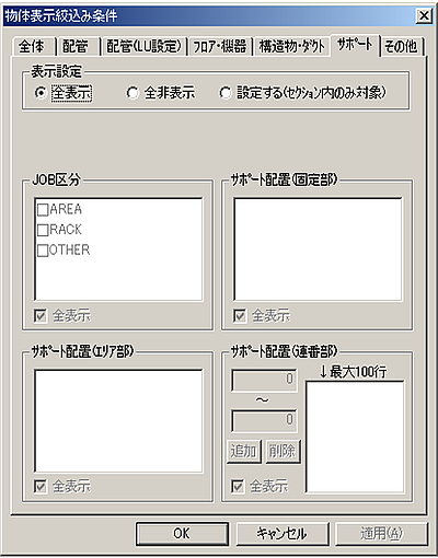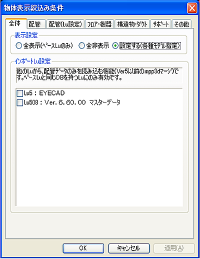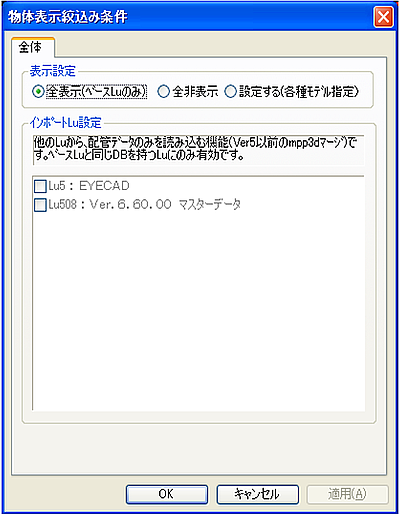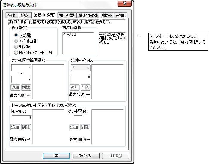 表示設定 内容 全表示(ベースLuのみ) 現在起動以外のLu情報が表示されます。 全非表示 (通常選択しません) 設定する 他のLuから配管Dataを読込みたい時、あるいは選択状態にあるSection内の絞込み条件設定を行いたい時に選択します。 インポートLu 全DataのLu中から配管Dataを表示したい時にチェックします。 (V5.20以前のmpp3dによるLu併合機能です)