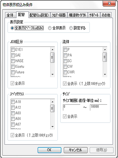“配管”をClickすると、配管表示の絞込み条件設定が可能になります。
