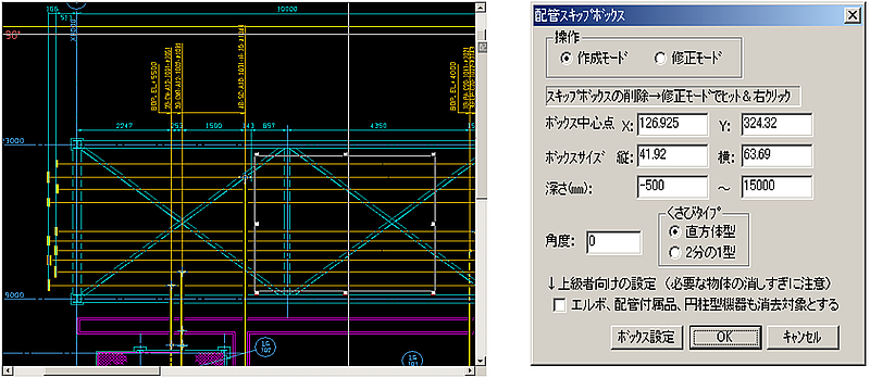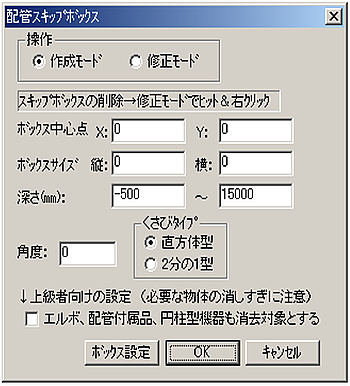 - 【ファイル】中の【配管スキップボックス設定】を選ぶと、Dialogが表示されます。