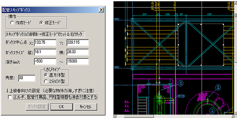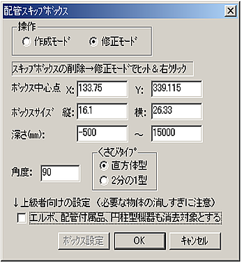 - 修正は、【配管スキップボックス】Dialogを発生させ、「操作」の中の修正Modeにチェックを入れてください。画面上にボックスが表れます。