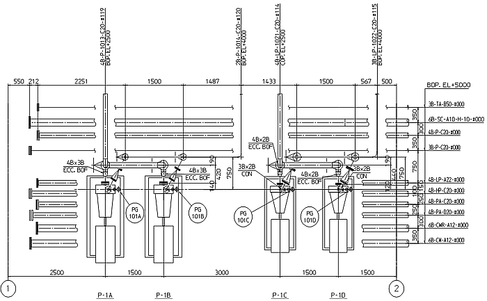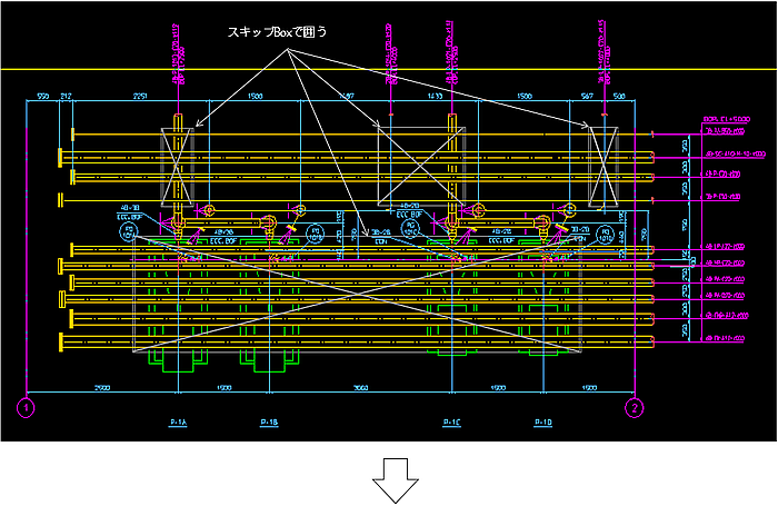 - 上下に配管が通っているような場合に、下部を図面に表現したい時、その部分をスキップボックスで囲います。