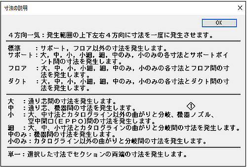 これをClickすると、寸法発生に関するヒントを示す下図の寸法の説明ダイアログが表示されますので、参考にしてください。