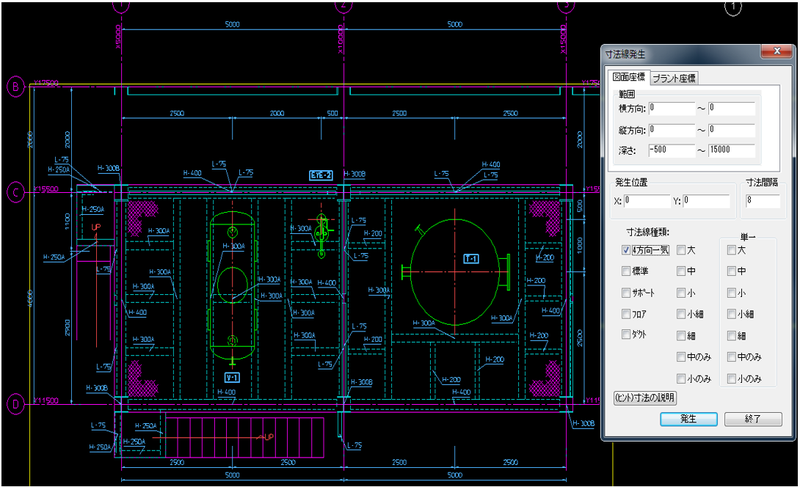 寸法発生種 発生させる内容 大寸法 通り芯間の寸法です。 中寸法 通り芯、機器間の寸法です。 小寸法 大、中寸法とカタログライン以外の曲りと分岐、機器ノズル、空中開口(EPPO)間の寸法です。 小細寸法 大、中、小寸法とカタログラインの曲りと分岐間の寸法です。 中のみ寸法 機器間の寸法です。 小のみ寸法 カタログライン以外の曲がりと分岐間の寸法です。 サポート中寸法 中寸法とサポートポイント間の寸法です。 サポート小寸法 小寸法とサポートポイント間の寸法です。 フロア大寸法 大寸法とフロア間の寸法です。 フロア中寸法 中寸法とフロア間の寸法です。 フロア小寸法 小寸法とフロア間の寸法です。 ダクト大寸法 大寸法とダクト間の寸法です。 ダクト中寸法 中寸法とダクト間の寸法です。 ダクト小寸法 小寸法とダクト間の寸法です。