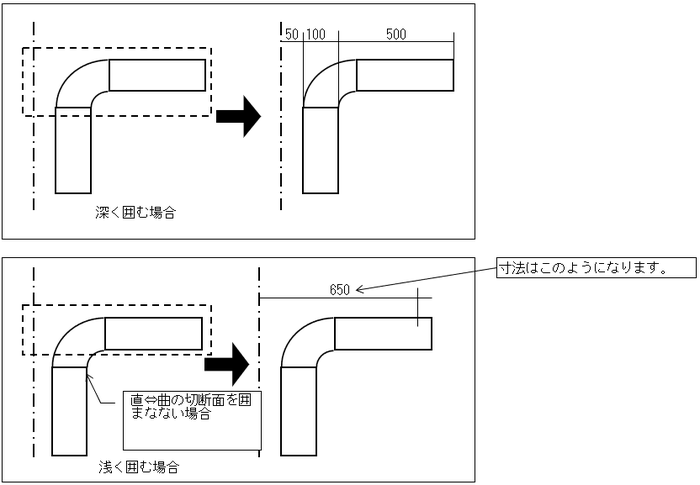 寸法ボックスの囲い方により、下図のような違いがありますので、使い分けてください。