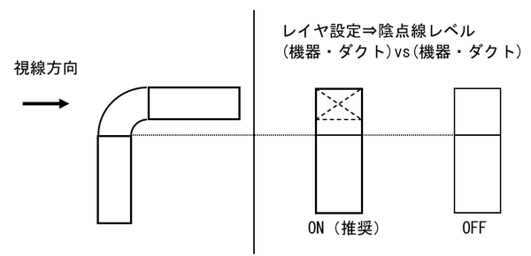また、ダクト寸法を使用するセクションの陰点線レベルレイヤについては、紙面垂直方向のダクトを認識するために、(機器・ダクト)vs(機器・ダクト)をONにすることを推奨します。