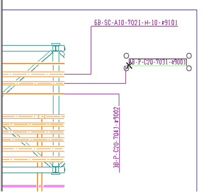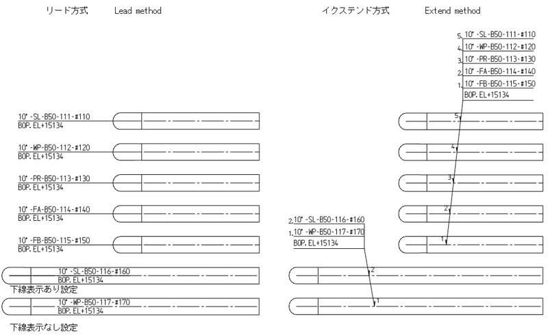 配管外にラインマークを移動し、かつラインマークが延長線上に存在しない場合は、延長線+文字列のアンダーライン+アンダーラインから延長線までのラインで構成された引き出し線を発生します。