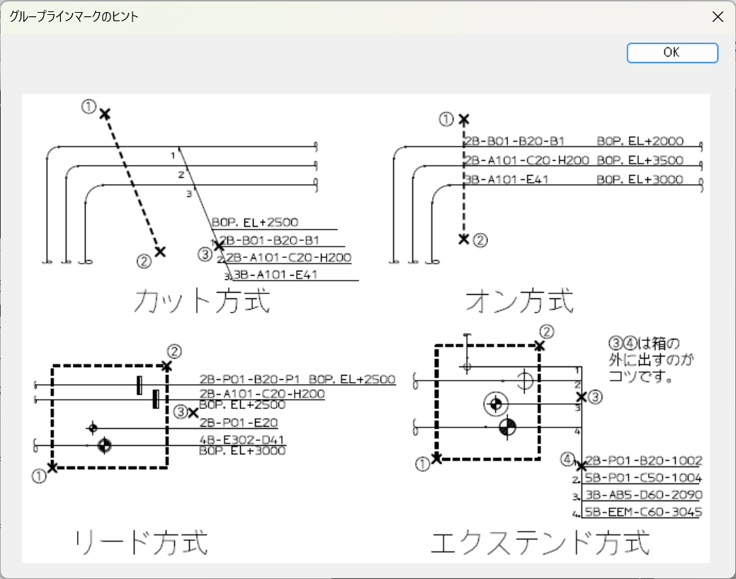 カット方式、およびイクステンド方式のグループラインマークの配管高さは、グルーピングされたそれぞれの配管の高さを一つで表現する性質上、高さの値の補正が行われるため、実際の高さとは多少異なる場合があります。