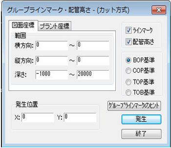 メニューの〔発生(C)〕-〔グループラインマーク(G)〕―〔〔カット方式(C)〕をClick。