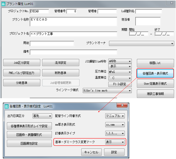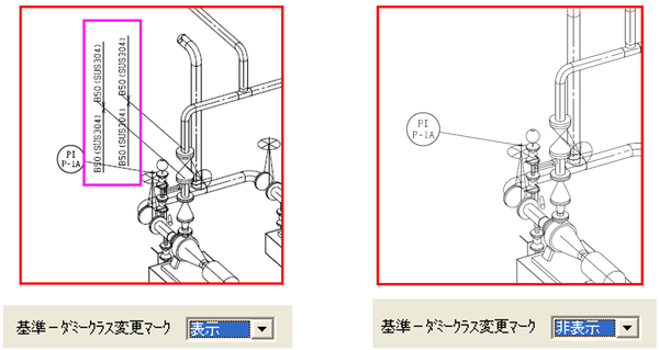 プラント属性定義の「基準-ダミークラス変更マーク」Flagが『非表示』になっている場合、基準クラス-ダミークラス間のクラス変更マークは表示されません。