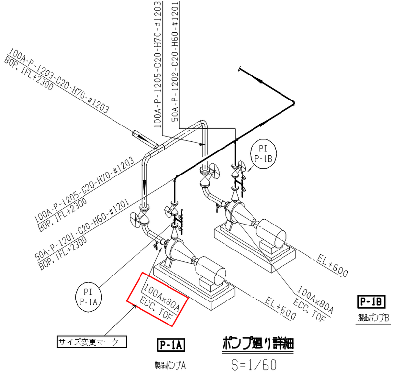 よって、1本の配管に6個以上のクラス変更がある場合は、最初から5番目までのクラス変更マークは表示しますが、6番目以降のクラス変更マークは表示しません。