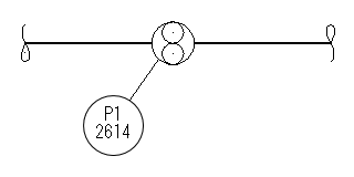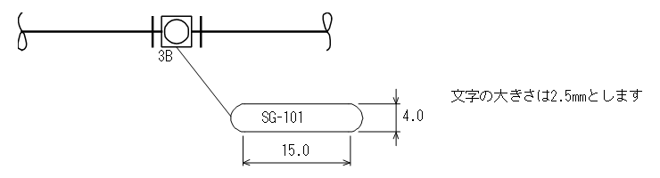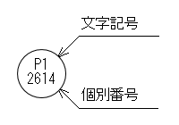 円で表わされていない図記号に、文字および個別番号を記入する必要のある場合は、その図記号から斜めに引き出し線を出し、その端に円を描き、この中に内の上半分に文字記号を、下半分に個別番号を記入します。