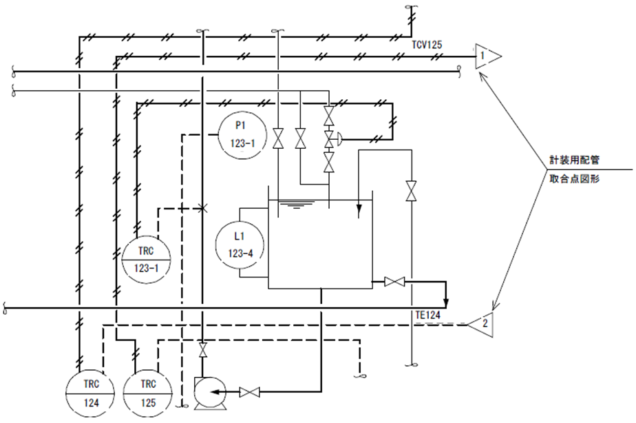 計装用配管の各図面間の継ぎは、計装用配管接続図形を用いて、上記のように記入してください。