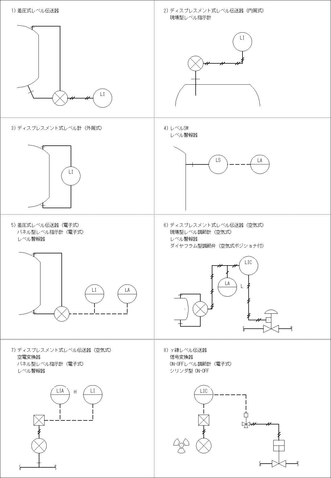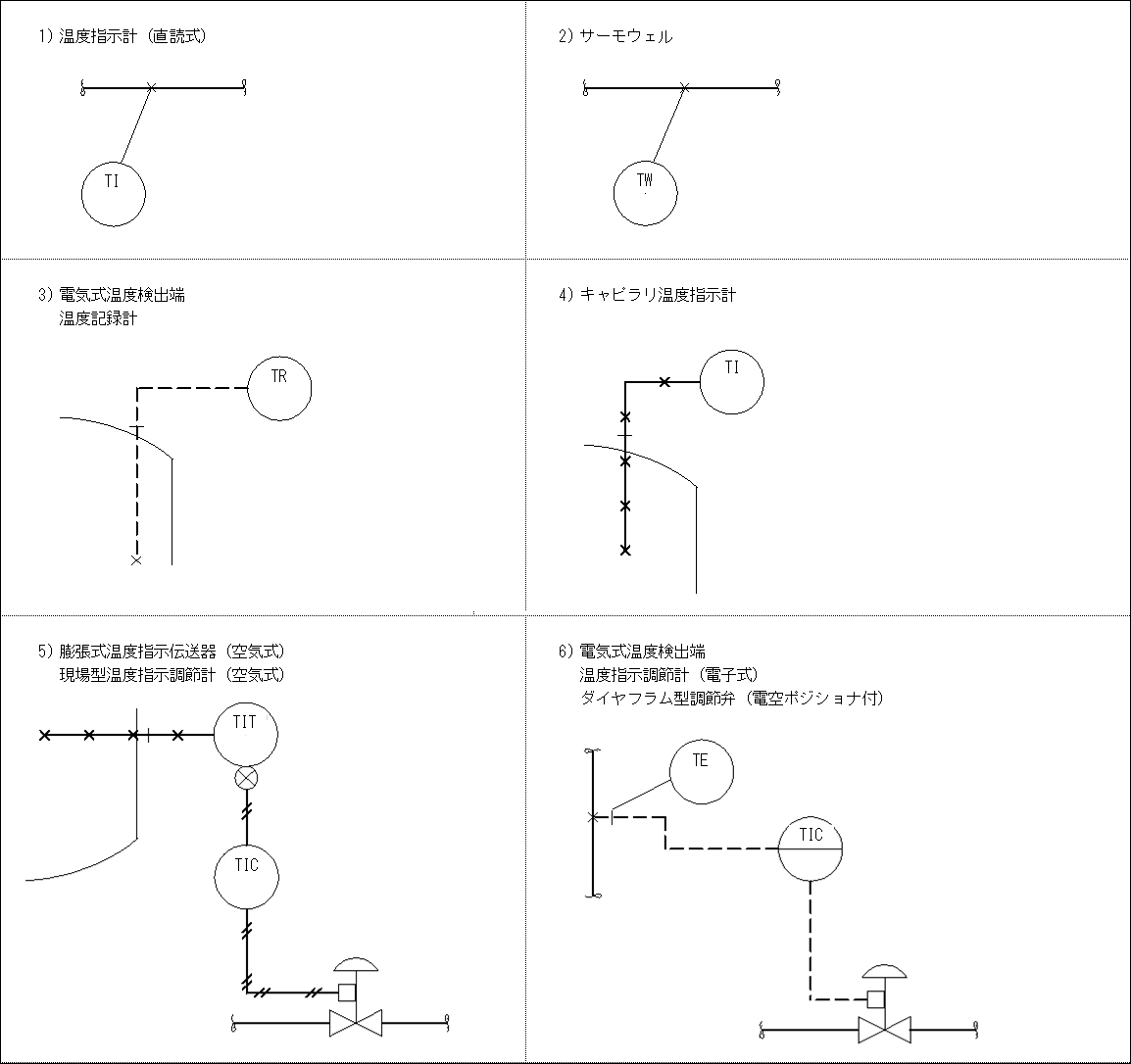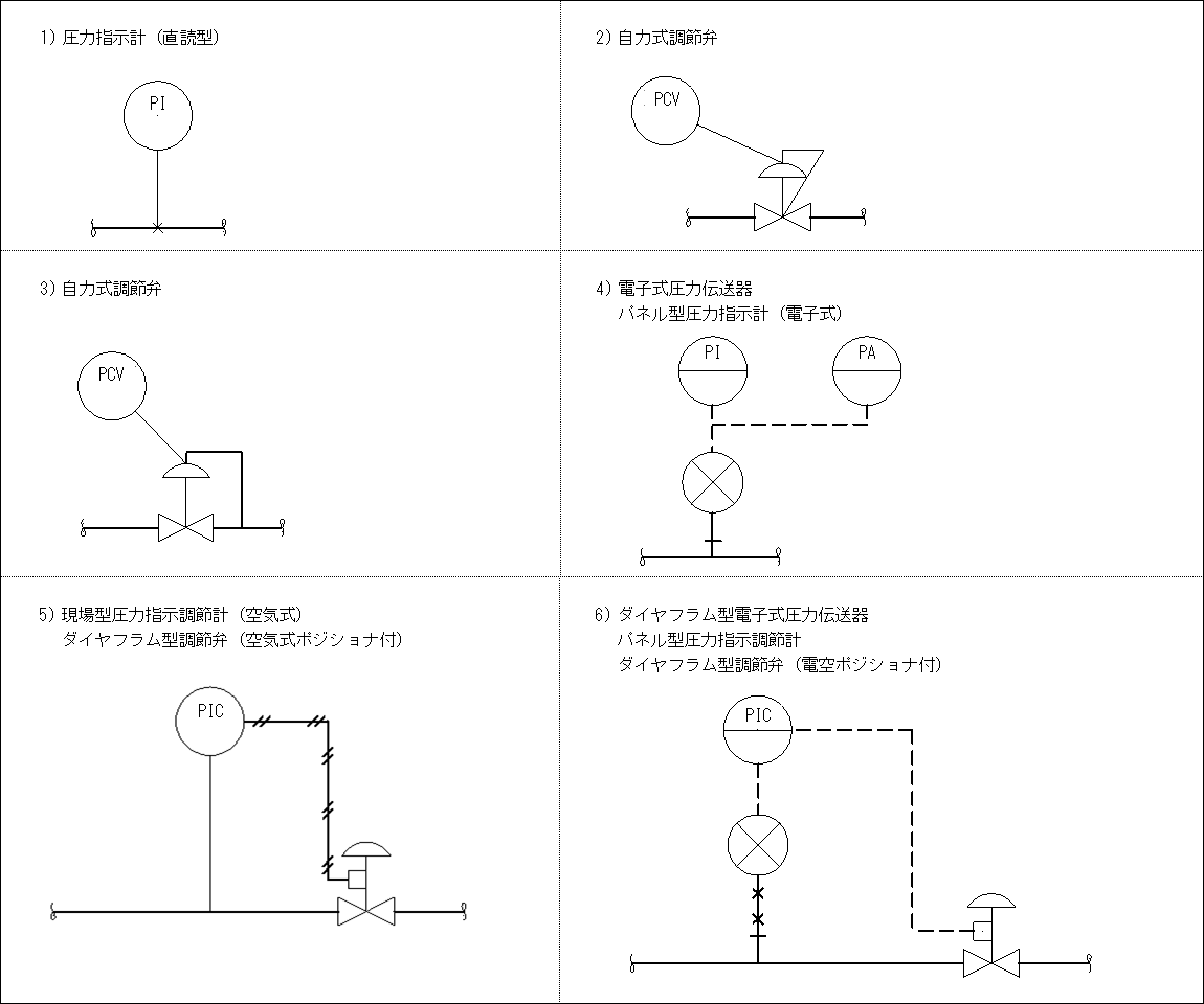 計装用記号の記入範囲は、表示計器、調節器、伝送器、検出器、調節部、演算器、およびそれらを結ぶ計測用配管、配線です。